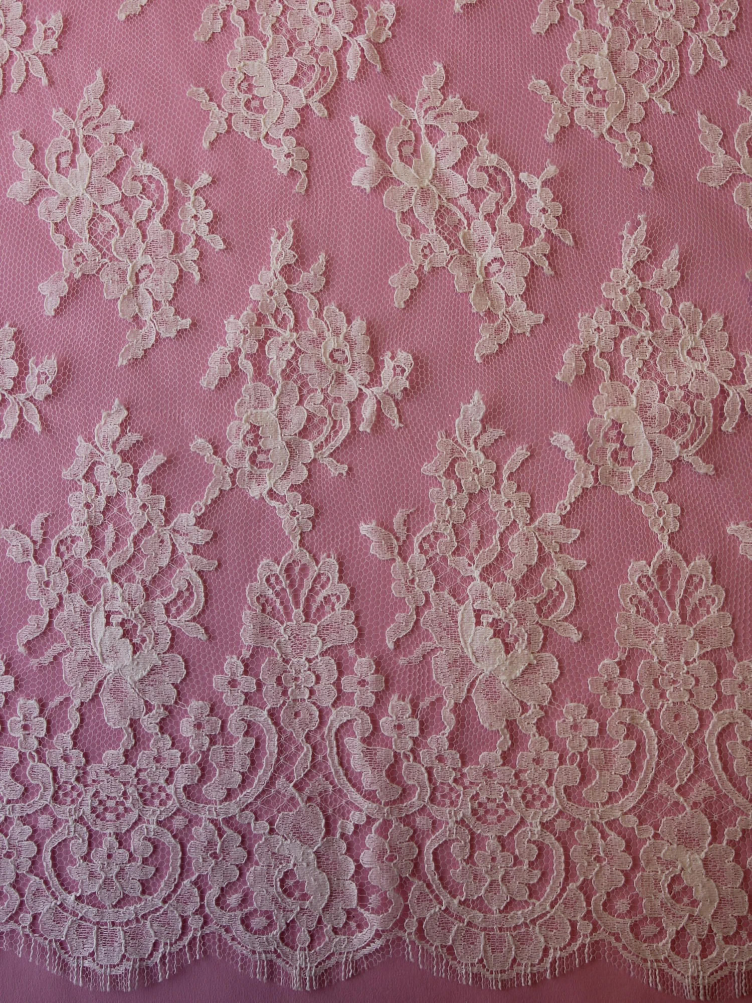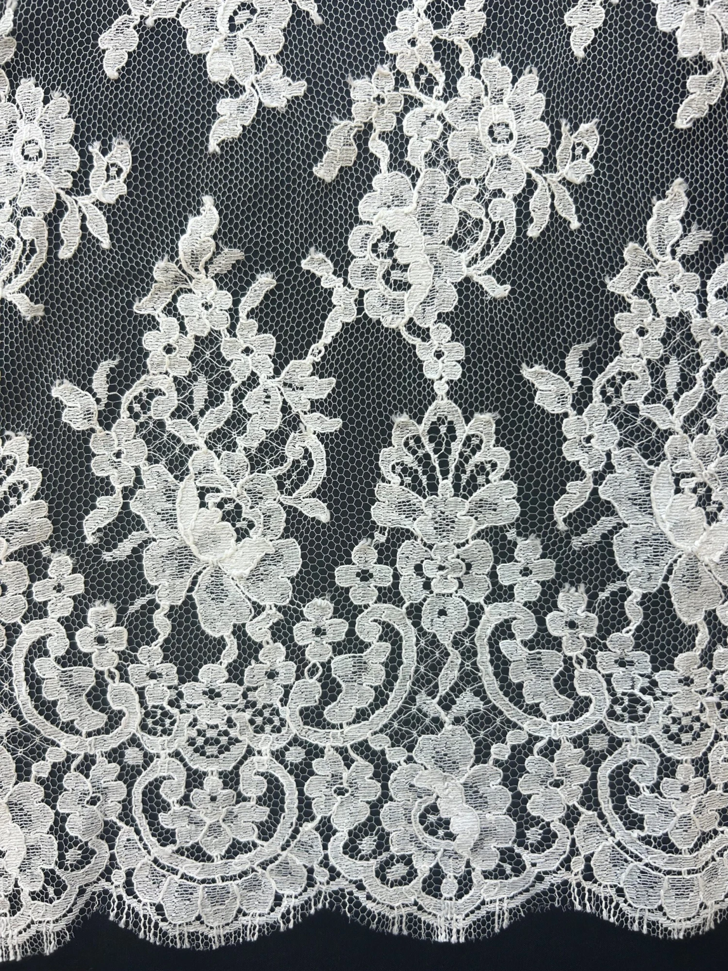 This is a very feminine Chantilly French Lace with symmetrical borders and floral motifs fairly closely spaced throughout the body of the pattern. The motifs are lightly corded and measure 12.5 cm (5″) tall. The edges of the lace are gently scalloped with a pattern repeat of 8 cm. (3.25″)