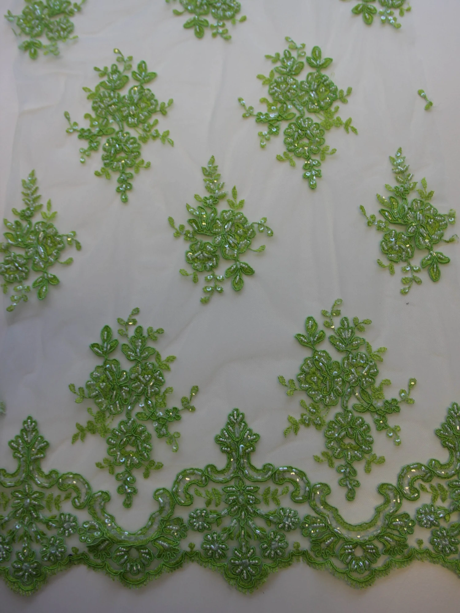 A vivid and attractive bright green Green border lace, which is beaded and corded on a fine tulle ground. Corded flowers, enhanced by beads and sequins, are used to add a touch of elegance to this beautiful design.