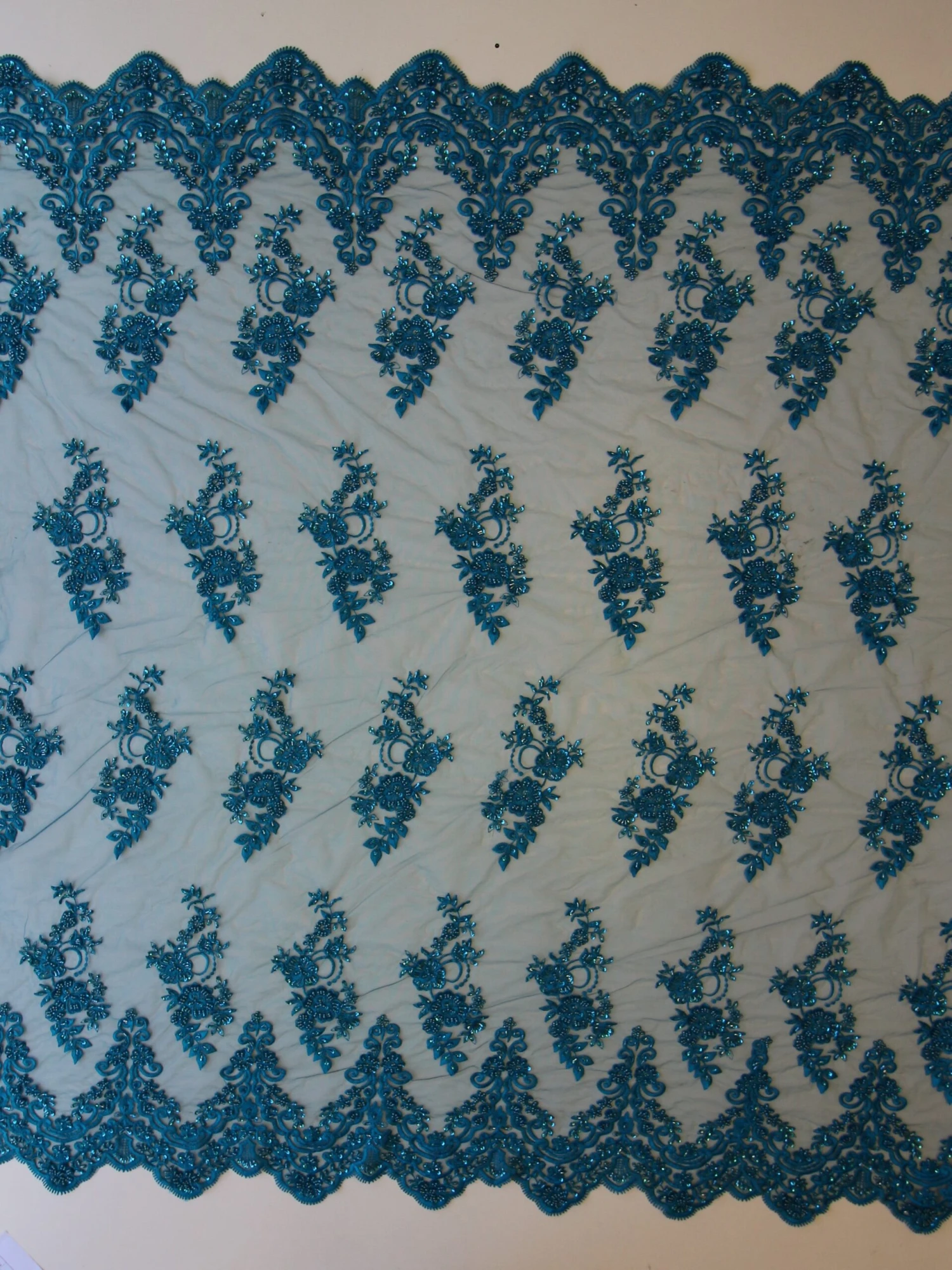 Pilar is a stunning embellished embroidery lace in a rich turquoise color and also available in navy and gold. The edge of the lace is especially attractive and dramatic with deep scallops, regal baroque inspired swirls and delicate flowers which are adorned with beads.