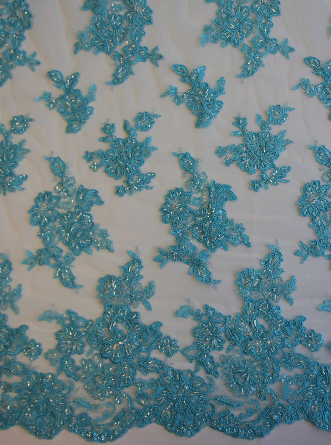 A bright and attractive turquiose lace that has three different Floral Motifs in the ground of this extremely elaborate design. The three motifs contain a single flower motif, a 2 flower motif and a 4 flower motif. The flowers are corded and feature an embroidered ground with sequins and beads being used to great effect. A single silver filigree thread is used to edge buds and stems.