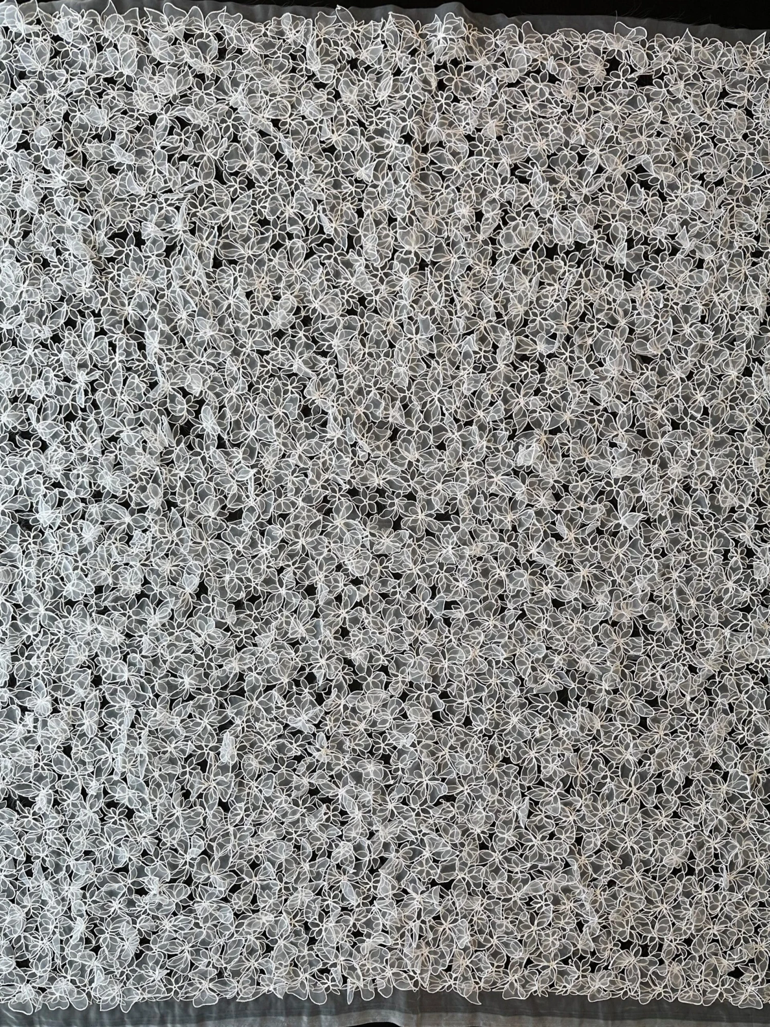 An organza base has been beautifully embellished with cording and then laser cut. On top of this sit delightful 3D flowers in a variety of sizes.