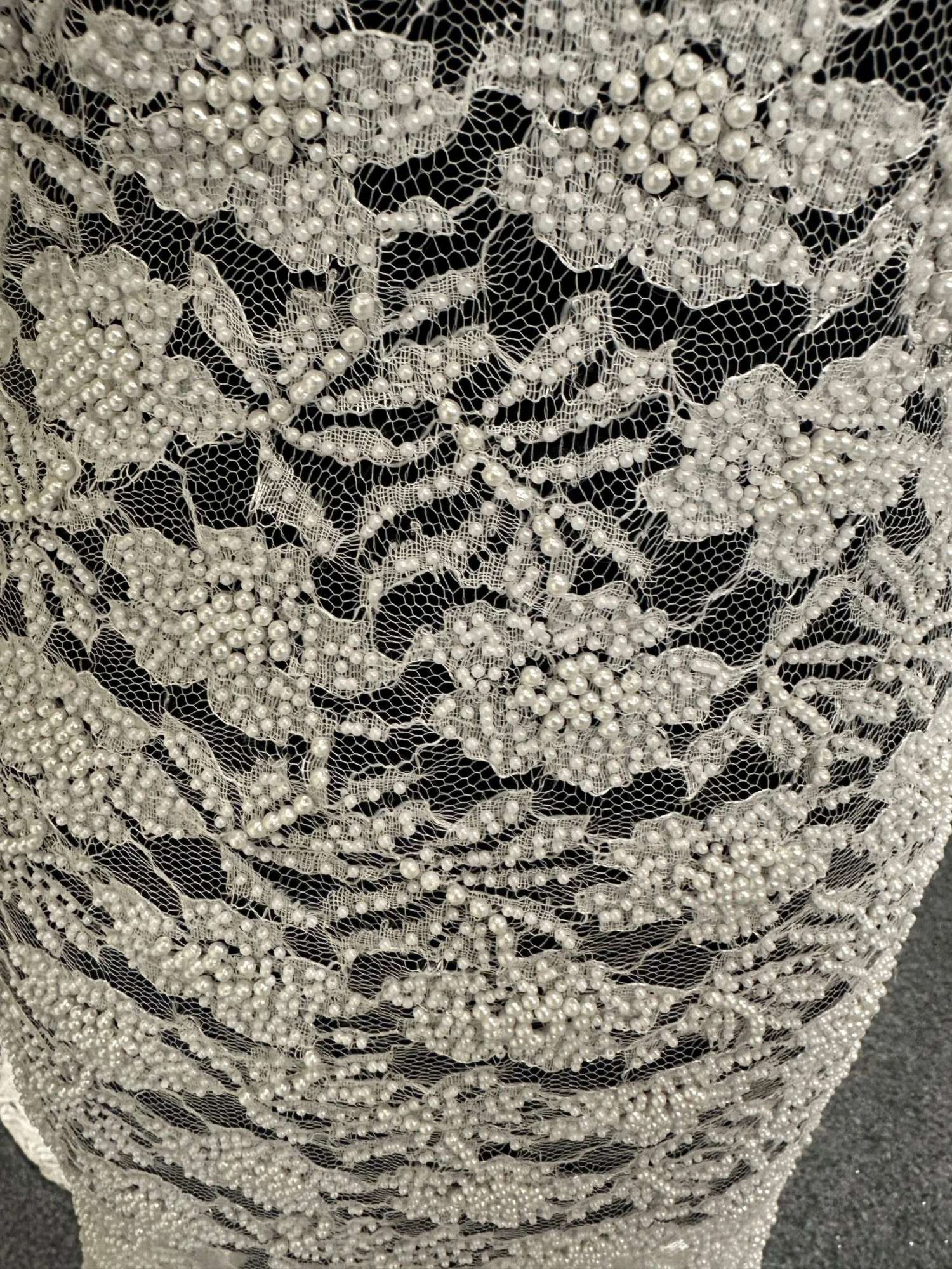 An enchanting white, pearl embellished lace fabric, that measures 110 cm (43″) wide. A delicate feminine lace has been beautifully embellished with pearls of different sizes to create a stunning fabric, that has plain edges. The flowers measure about 3.5 cm (1.5″) across.