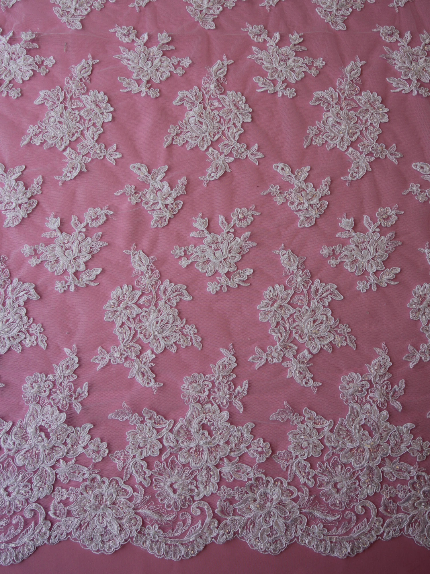 The identical borders are 25 cm (10″) in depth and are scallop edged. The width of the lace is 132 cm (52″).