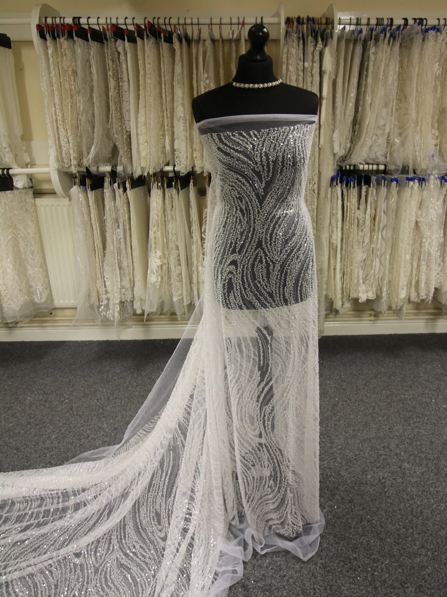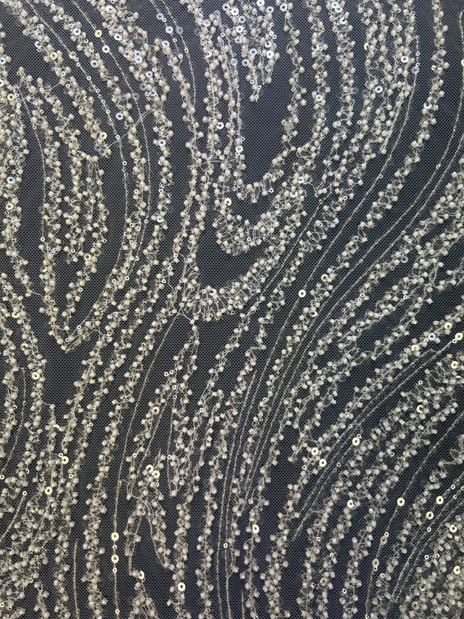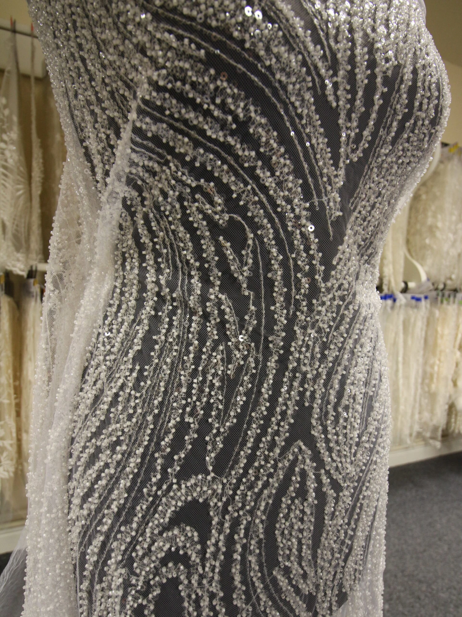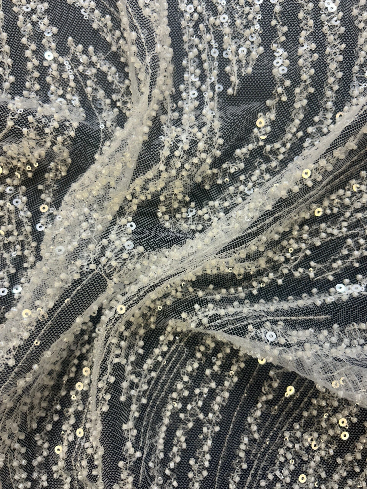 A glamorous and heavily bead and sequin embellished tulle base, this is white in color.Â
