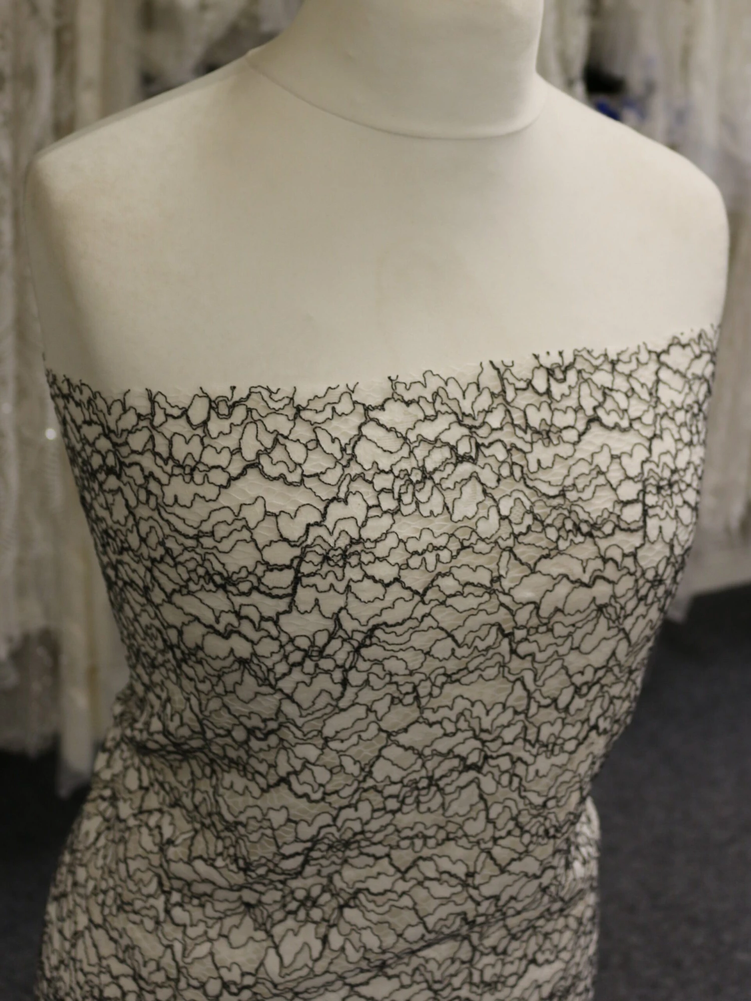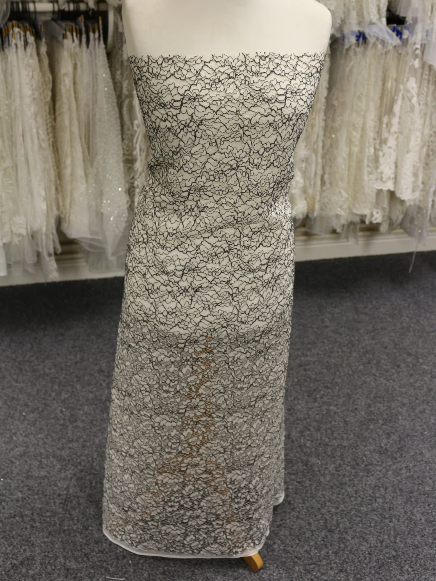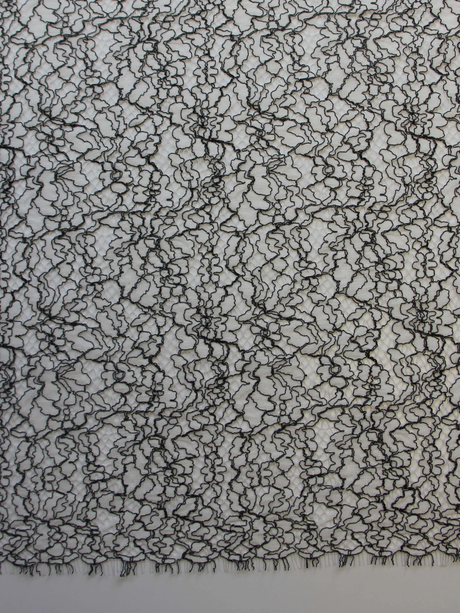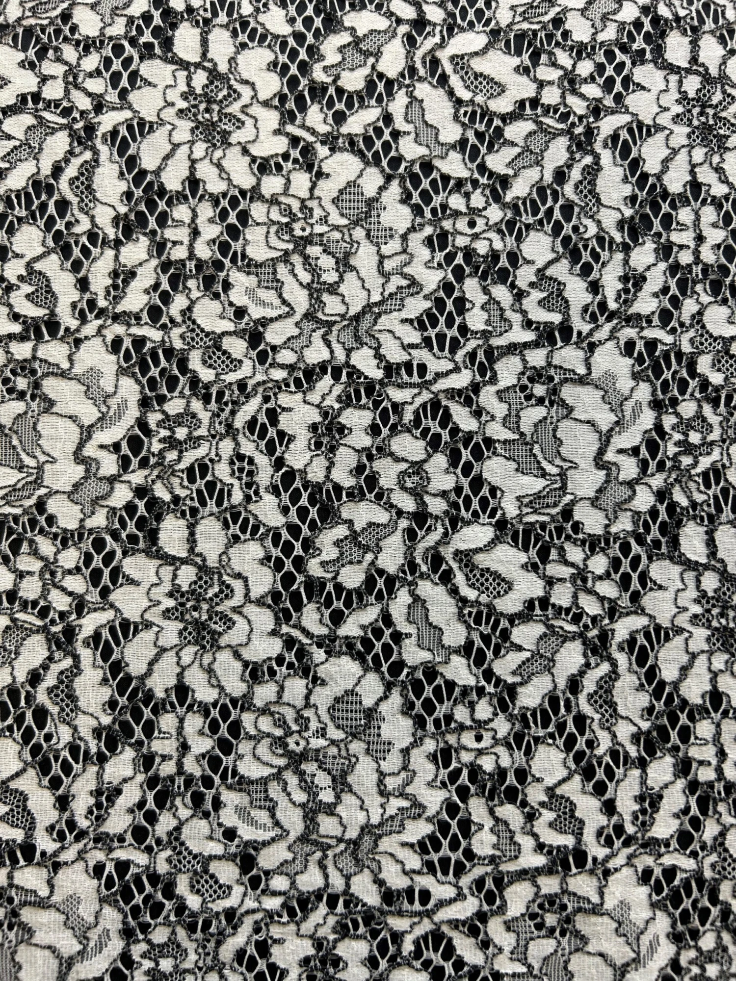 A very fashionable lace fabric in a yellow embroidered ground with black corded detail. This is supplied in panels that measure 1.6 metres (1.75 yards) The width is 148 cm (58″)