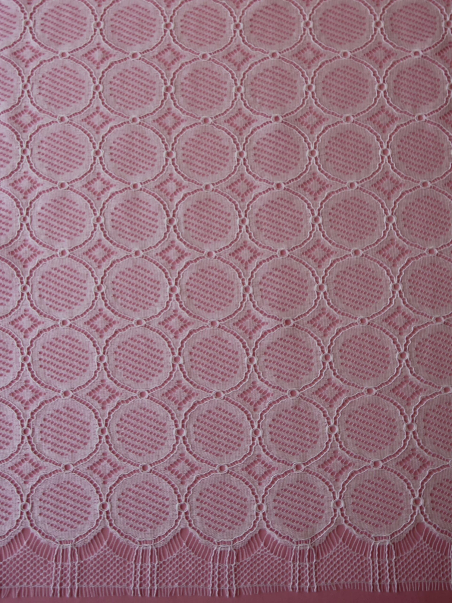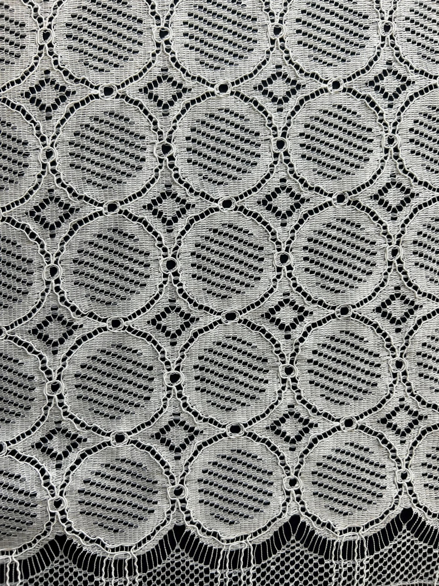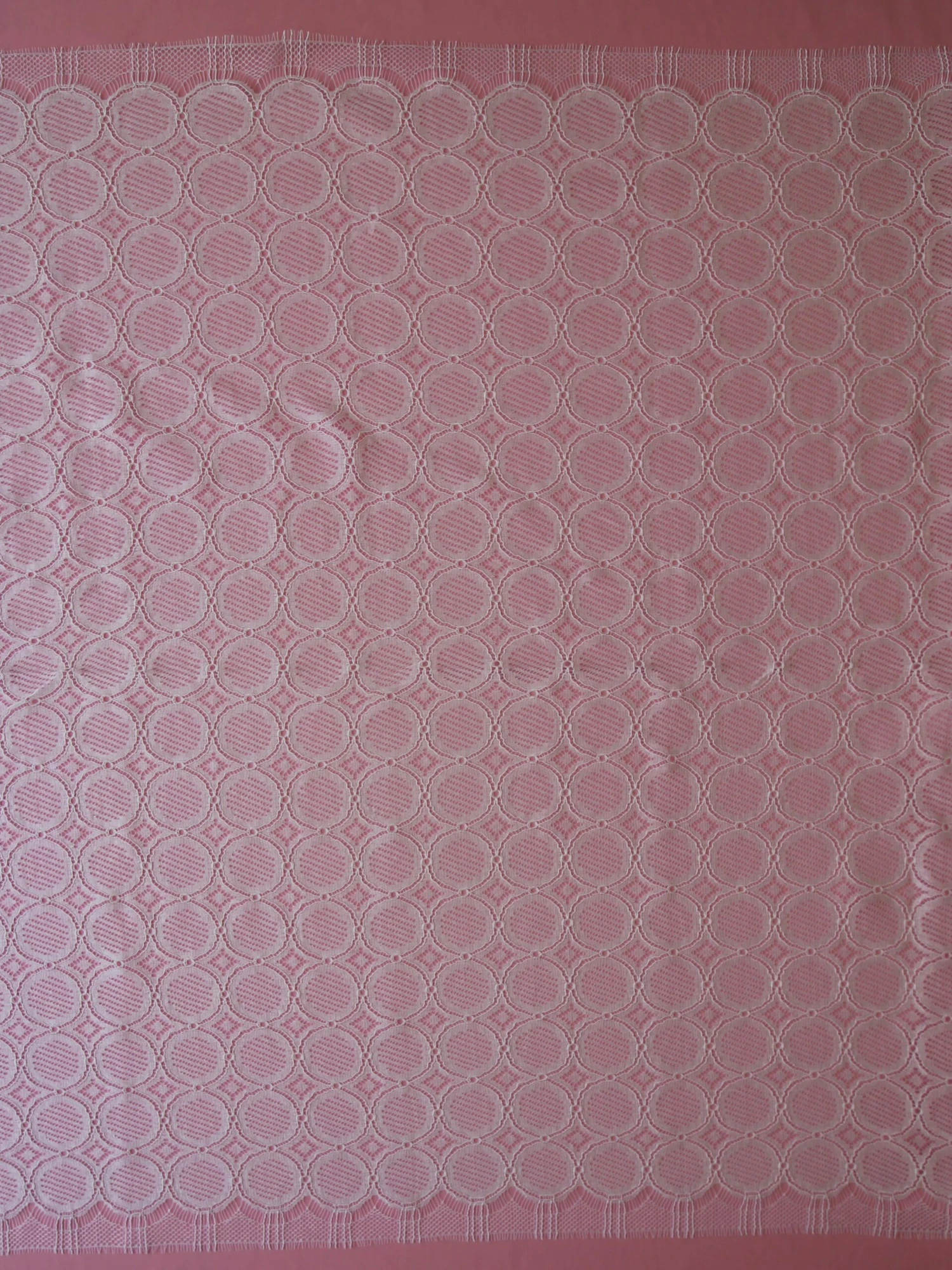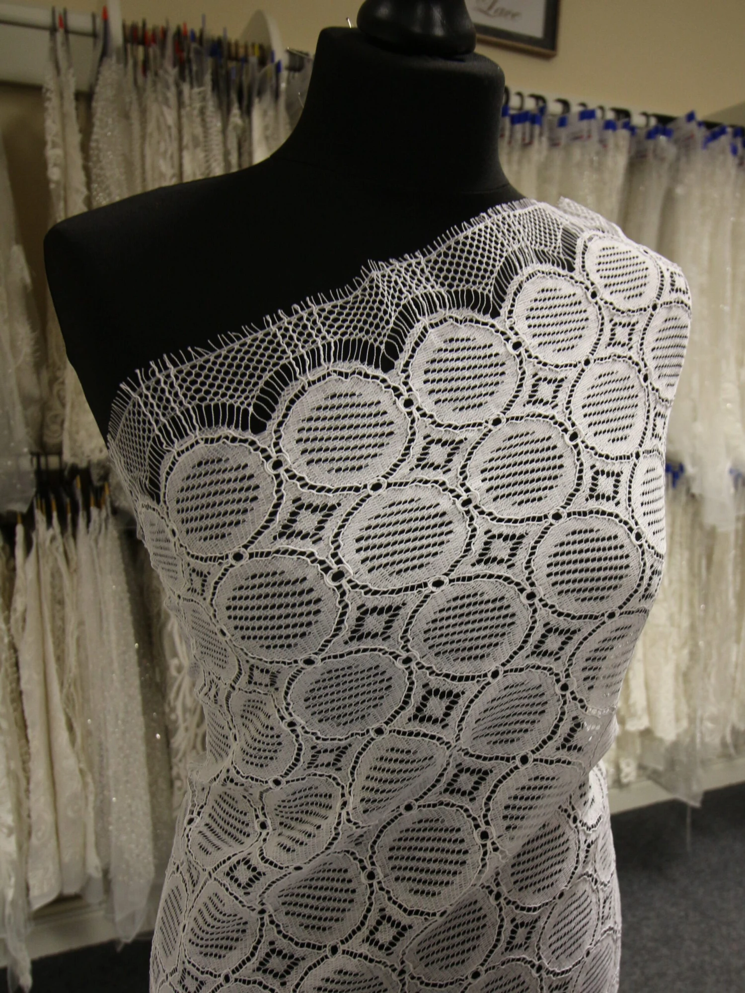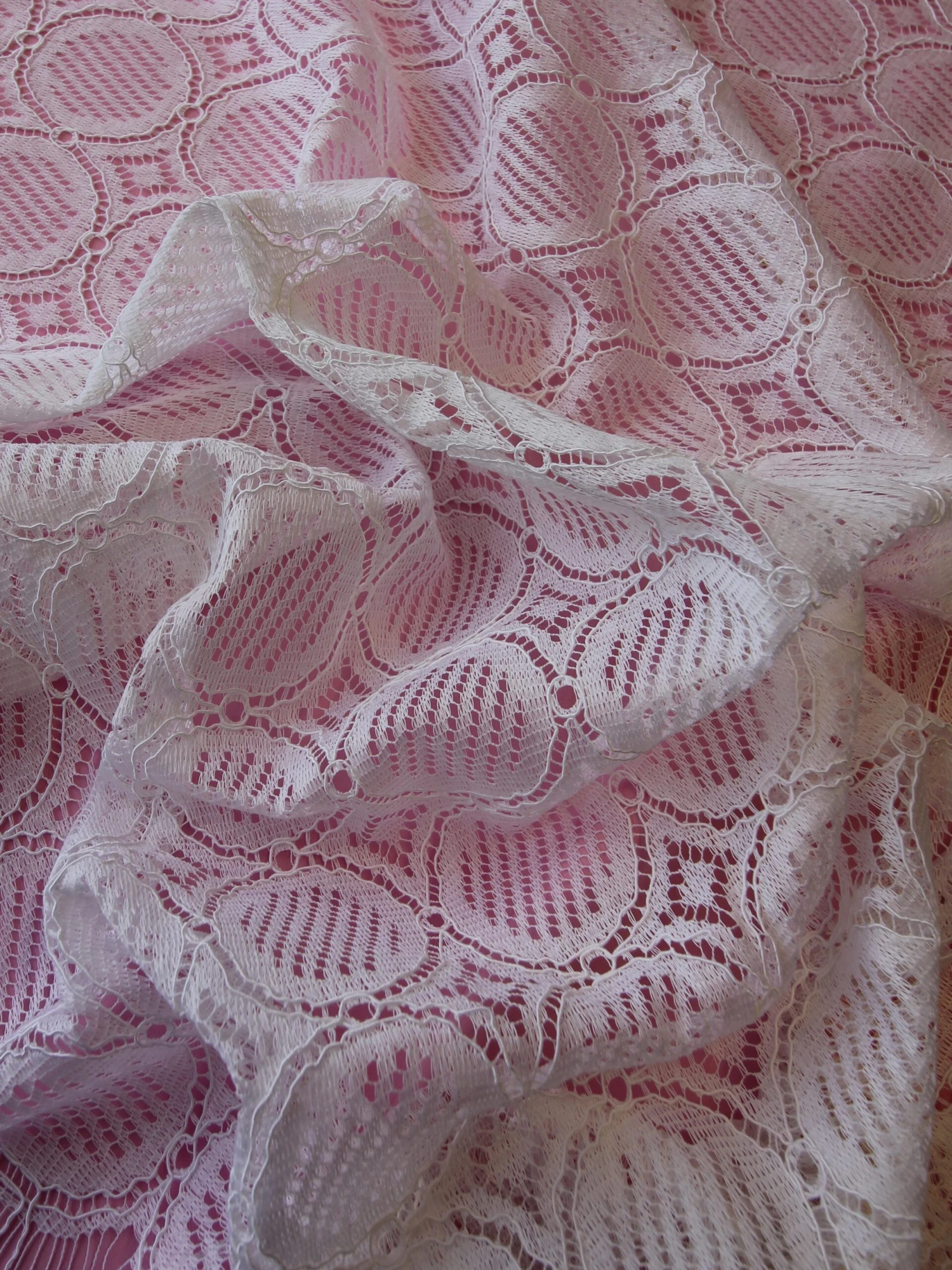 A delightful French Chantilly lace in white that is a perfect choice for a boho chic look and an eco conscious bride. This environmentally friendly non-floral lace fabric measures 110 cm (43.3″) wide. The base pattern is a geometric array of circles and diamonds and the composition is 82% Cotton/10% Viscose/8% Polyamide. The Cotton is GOTS and Viscose is FSC so both can be classed as “Eco”. Order lace sample – the first two are free.