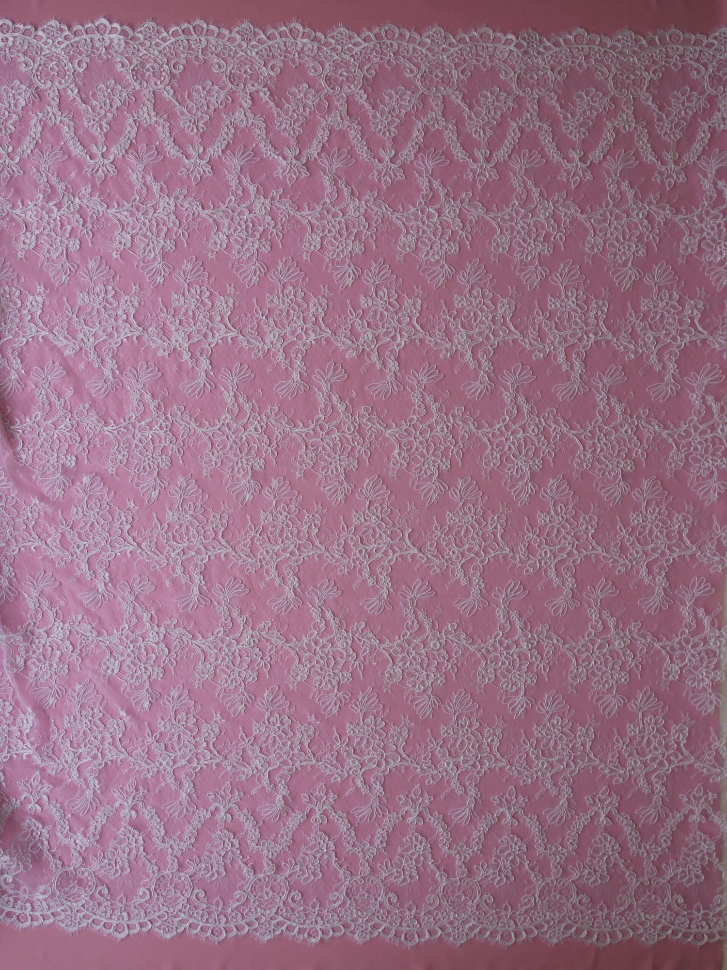 A beautifully corded white lace with matching fringed and scalloped edges. The base design has been raschel woven and then corded to give it some texture and relief. The width is 135 cm (53″)
