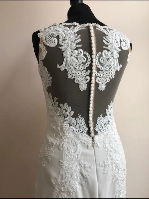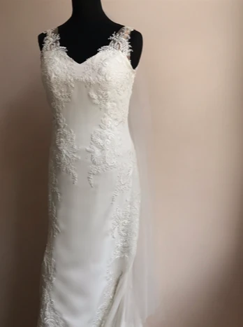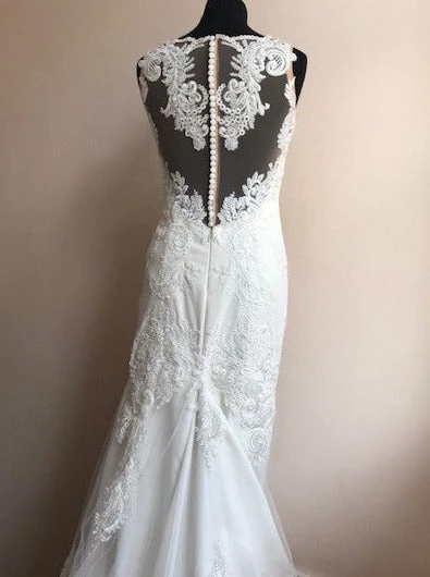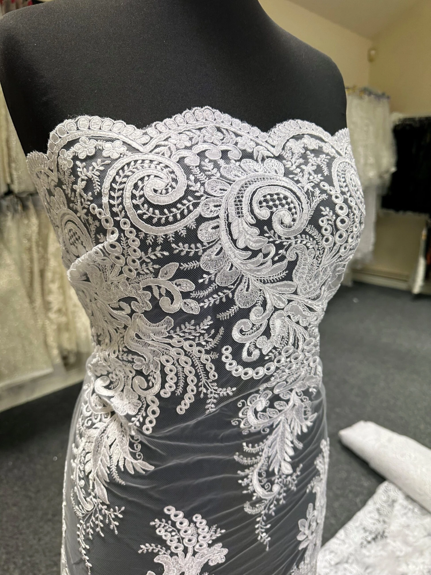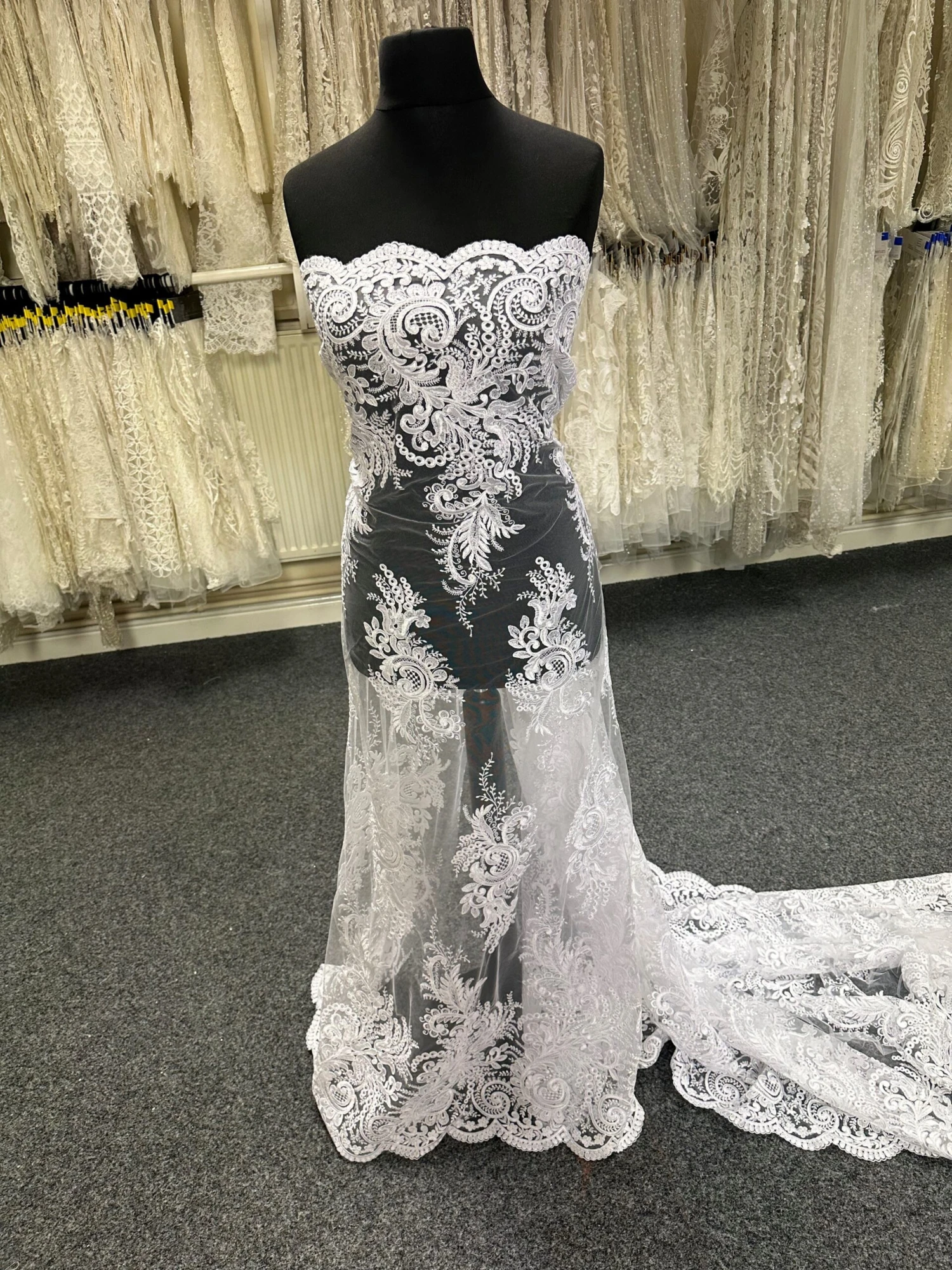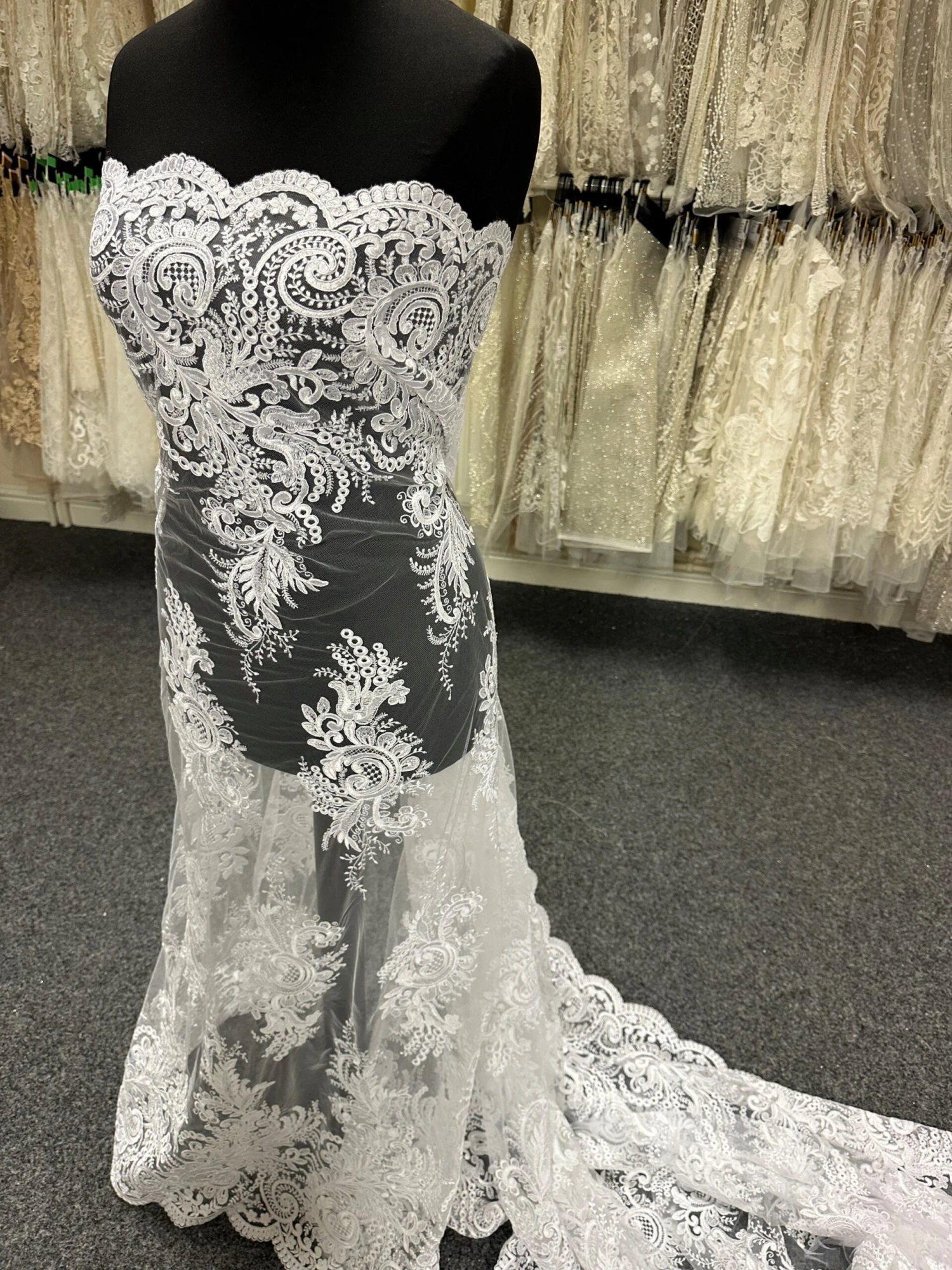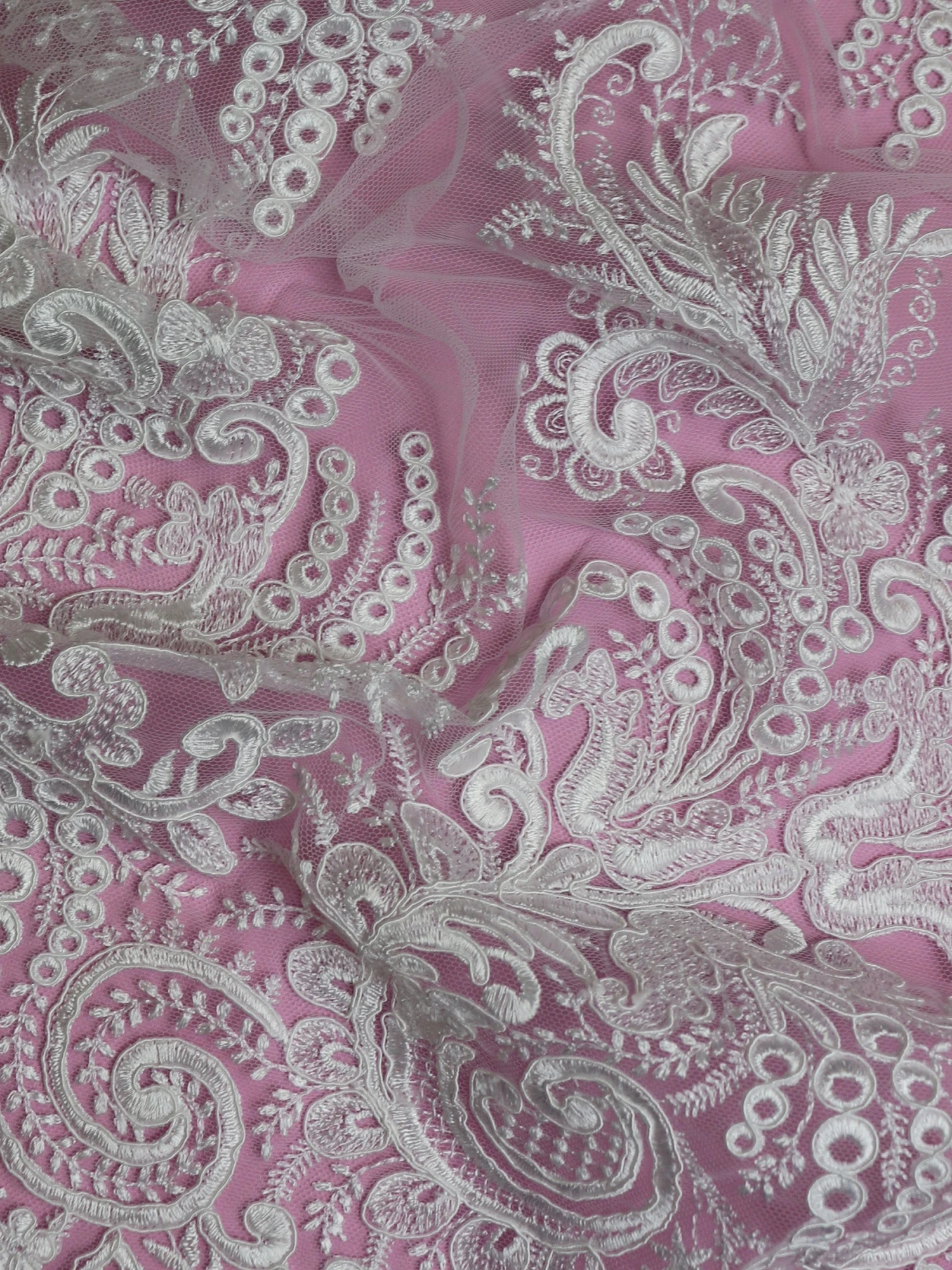 A designer ready lace on a white tulle base with a bounteous floral and leafy display swirling over this bridal lace.