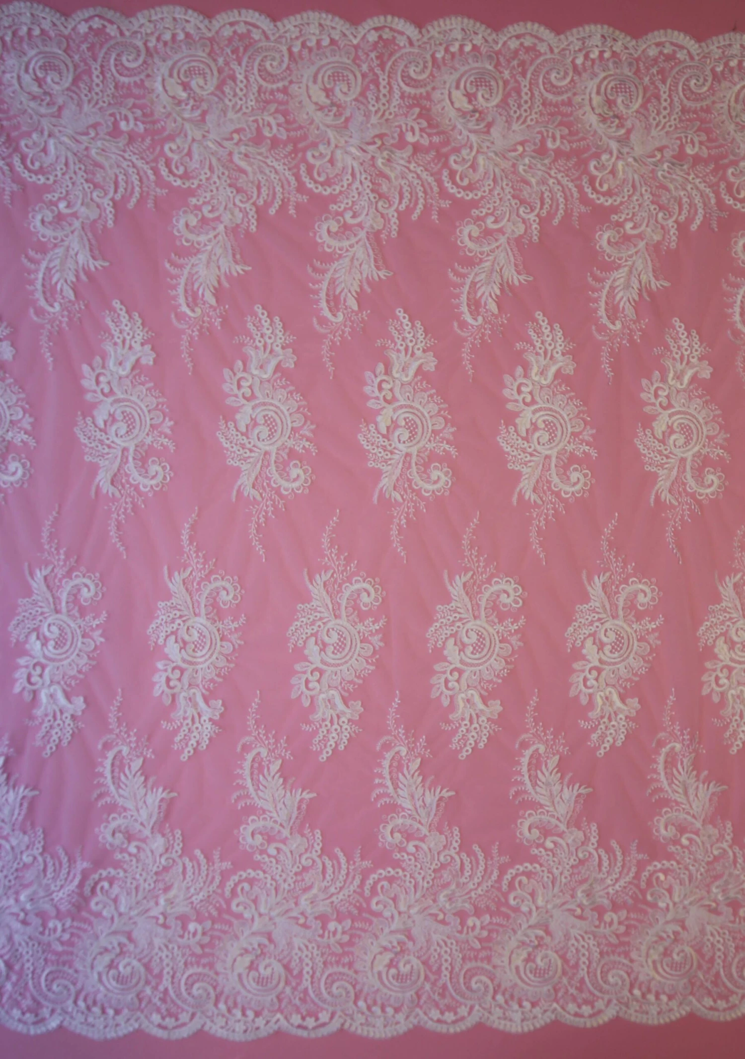 Boh is a bounteous, swirling, leafy floral extravaganza of a lace. Boh measures 132 cm (52″) wide and is embroidered onto an ivory tulle base. Sumptuously decadent, this lace also features a scalloped border and intricate cording. We also offer this lace in ivory.