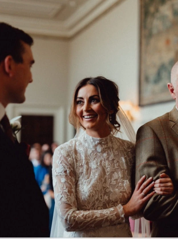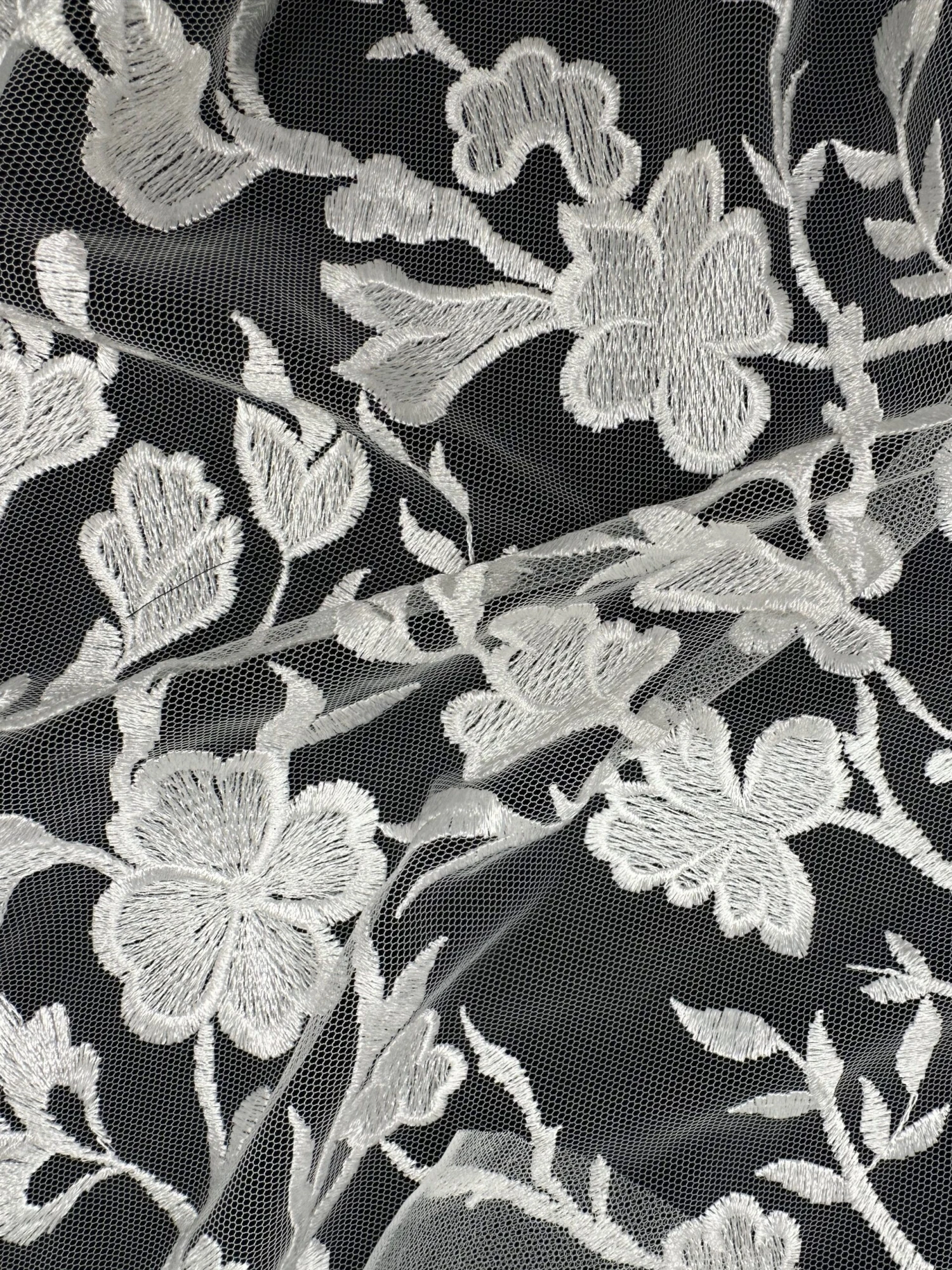 An attractively white embroidered bridal lace that features an attractive floral pattern that is different on one edge to the other.