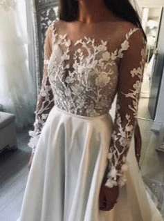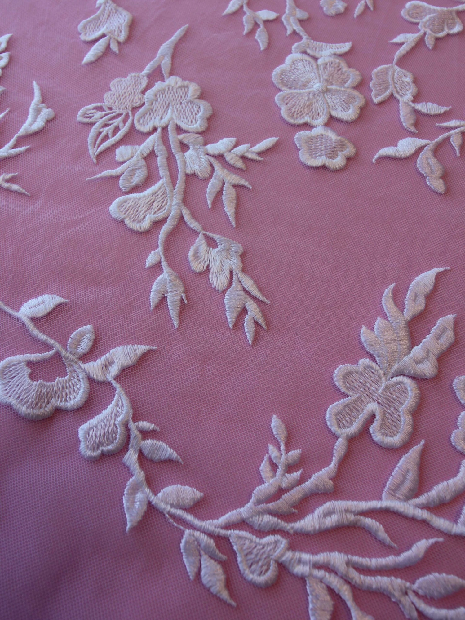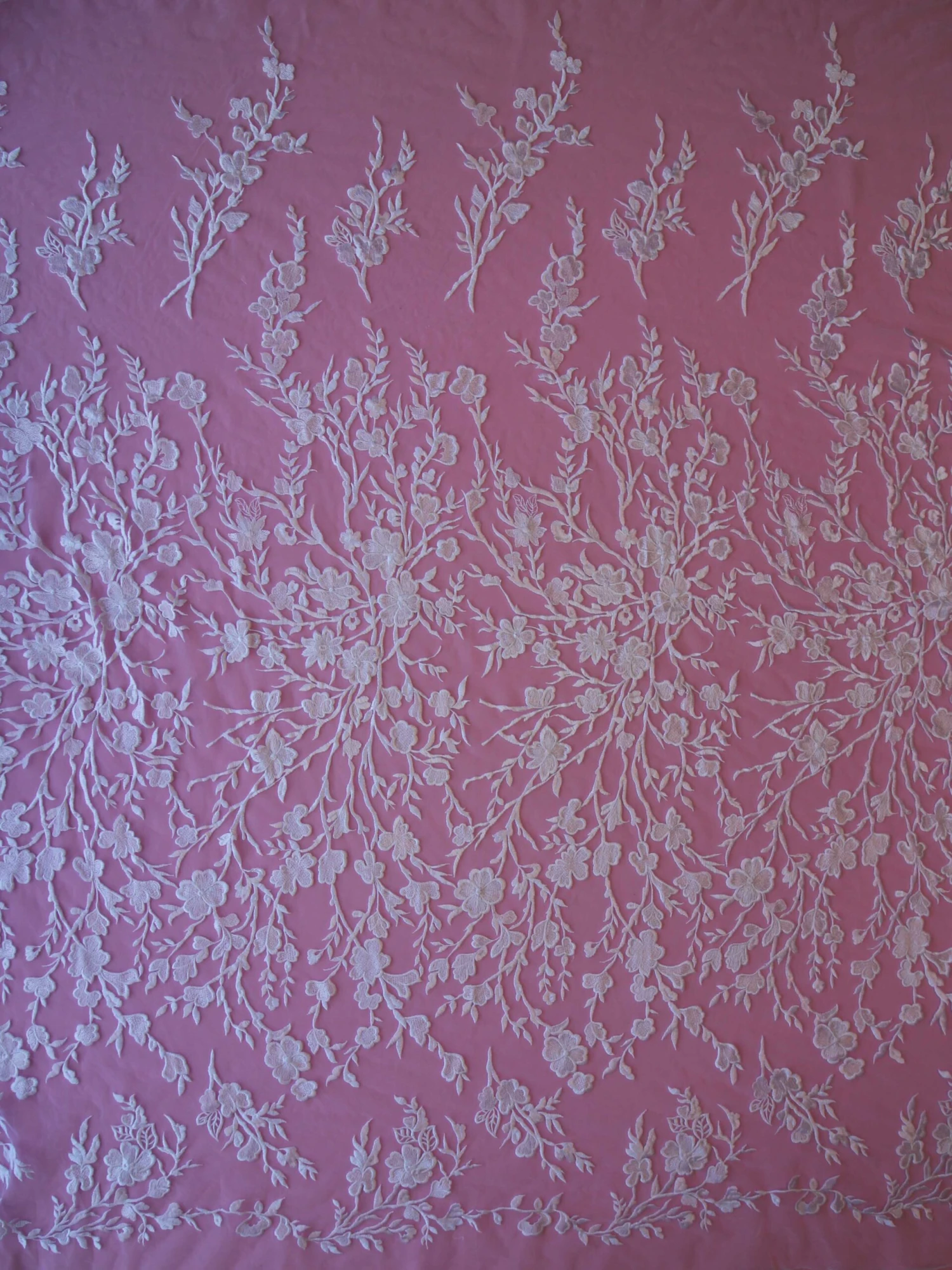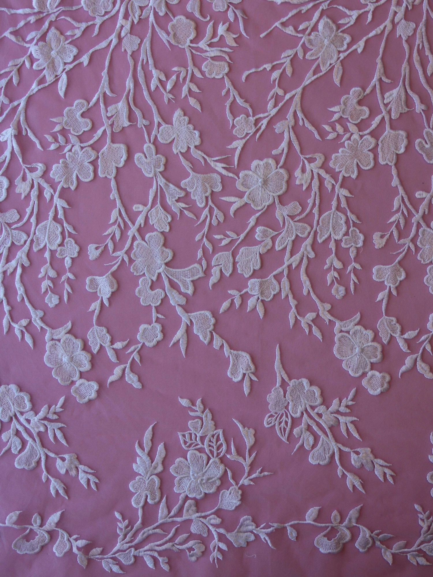 This has proved to be a popular modern, white lightweight bridal lace. Without beaded or sequin embellishment, it features attractive floral motifs set within leaves and vines across the width of the lace. This lace measures 132 cm (52″) wide and has a pattern repeat of 31cms (12.2″). Order a sample to appreciate the handle and quality of this lovely bridal lace which is also offered in ivory