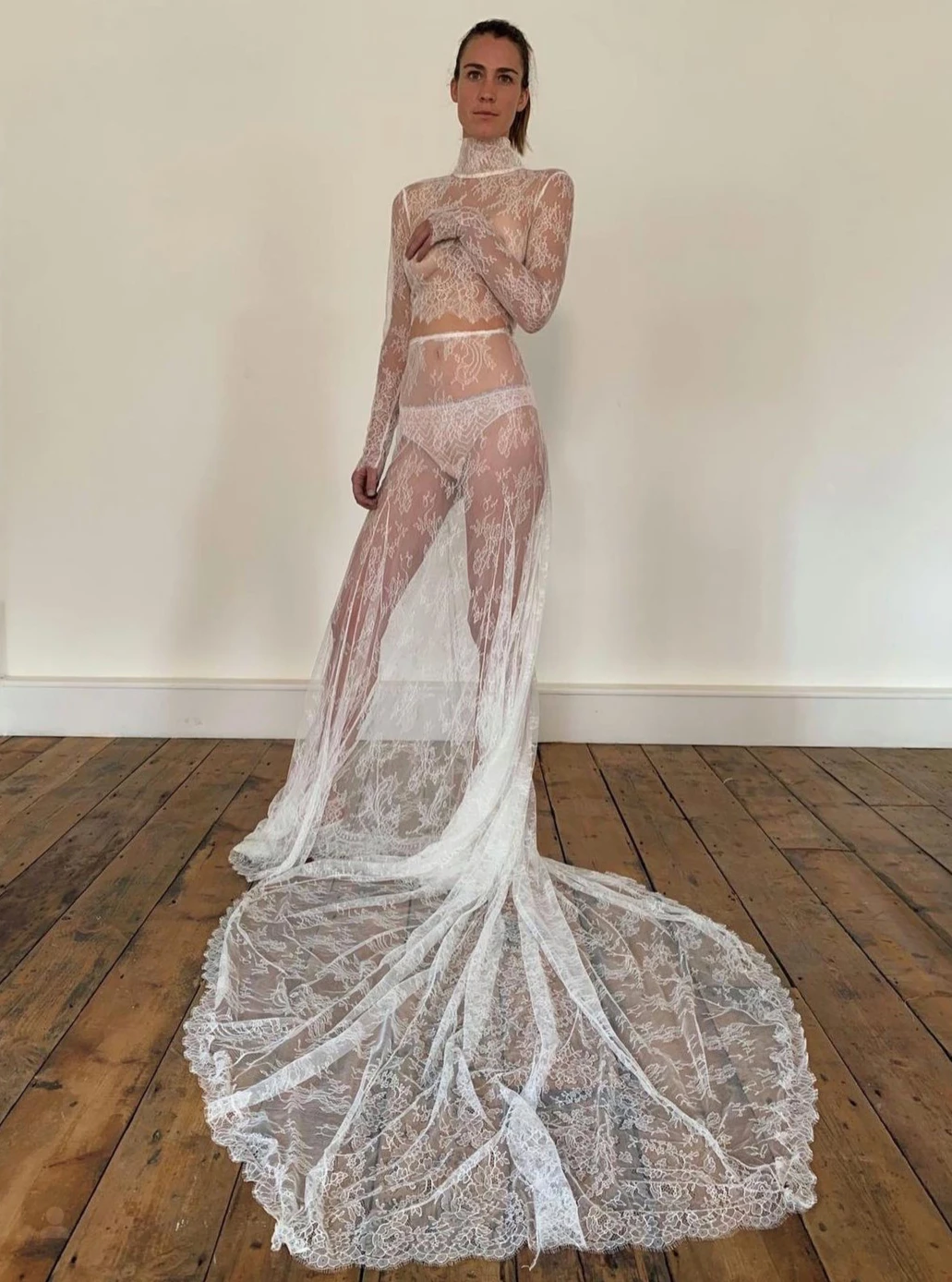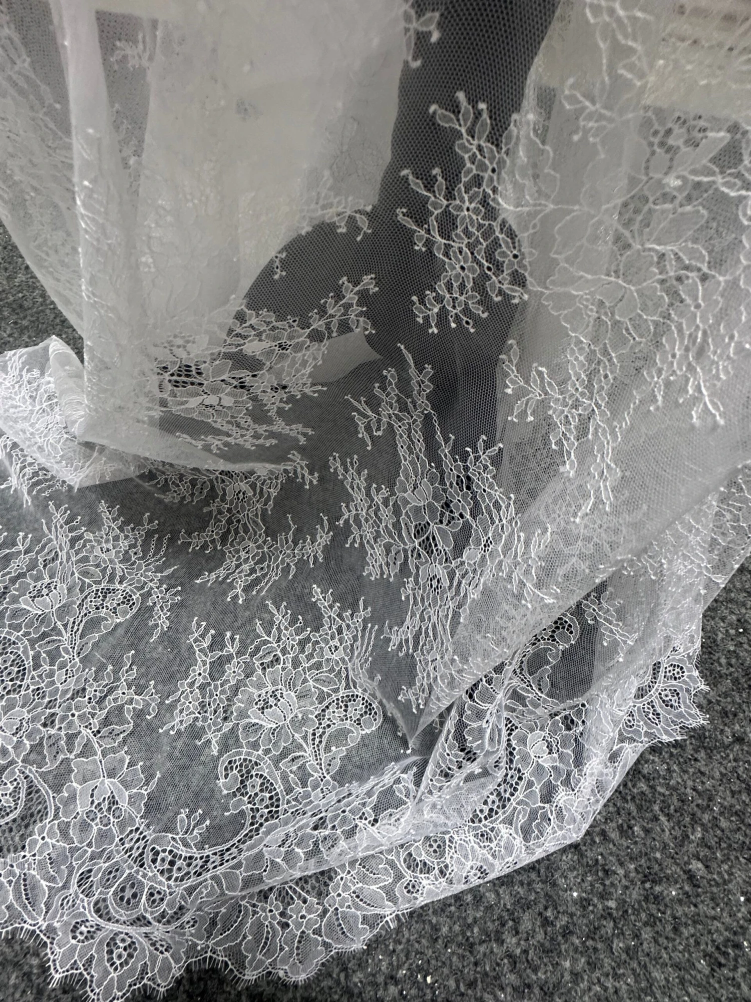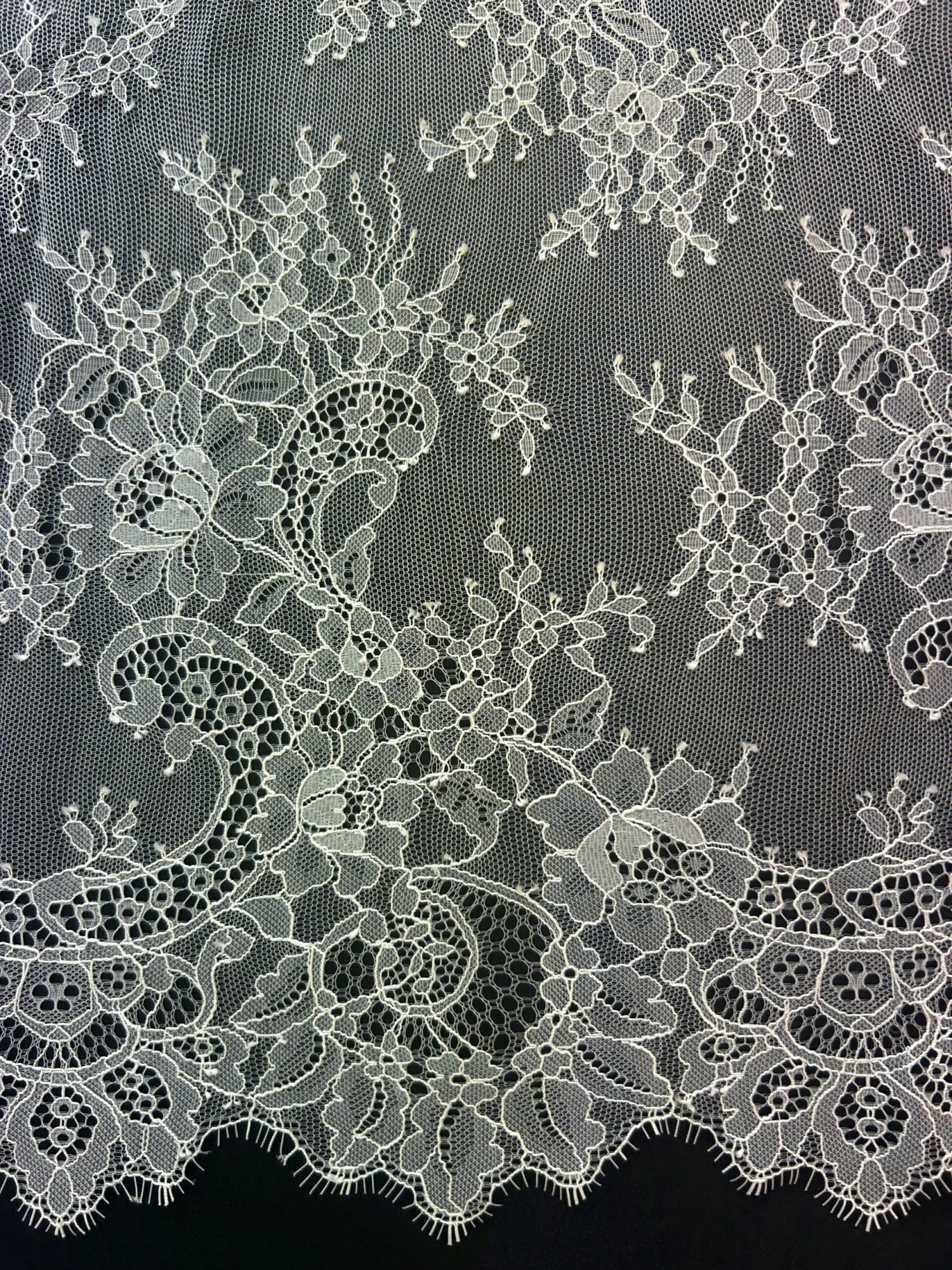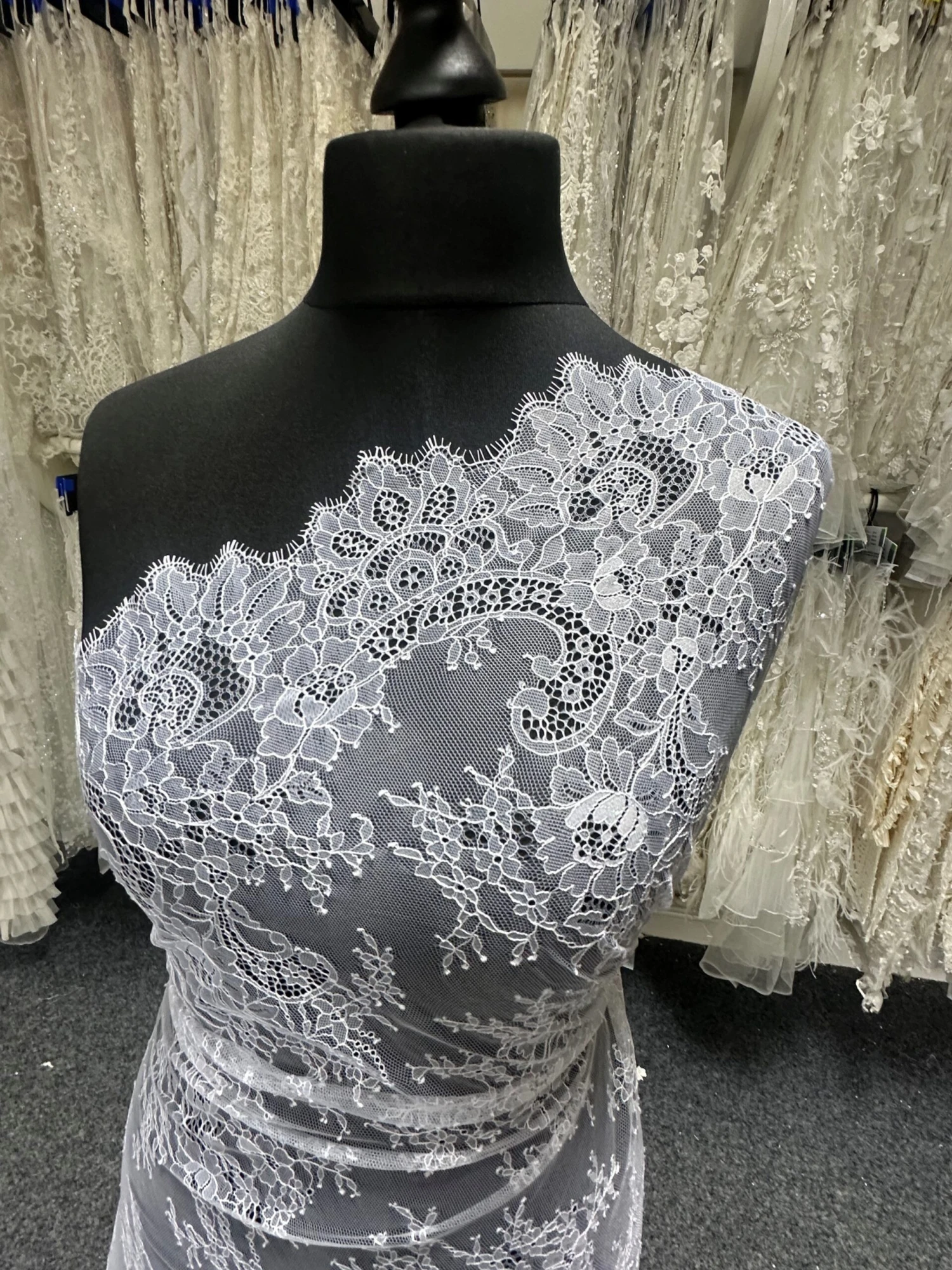 Katherine is an extremely feminine floaty lace, that has floral bouquets running through out the body which are embellished with cording. A variety of different sizes of weaves are used for the background. The lace measures 140 cm (55″) wide and is available in white, ivory and champagne.